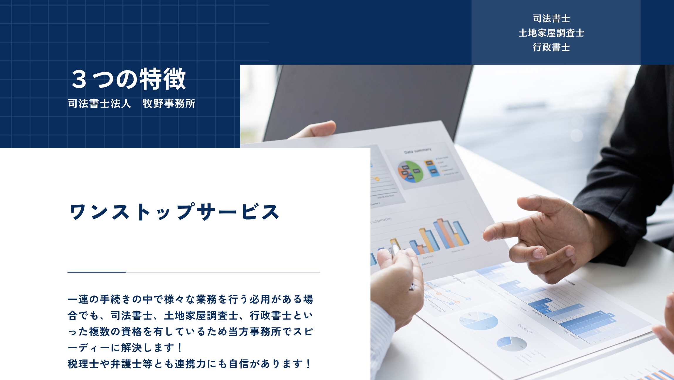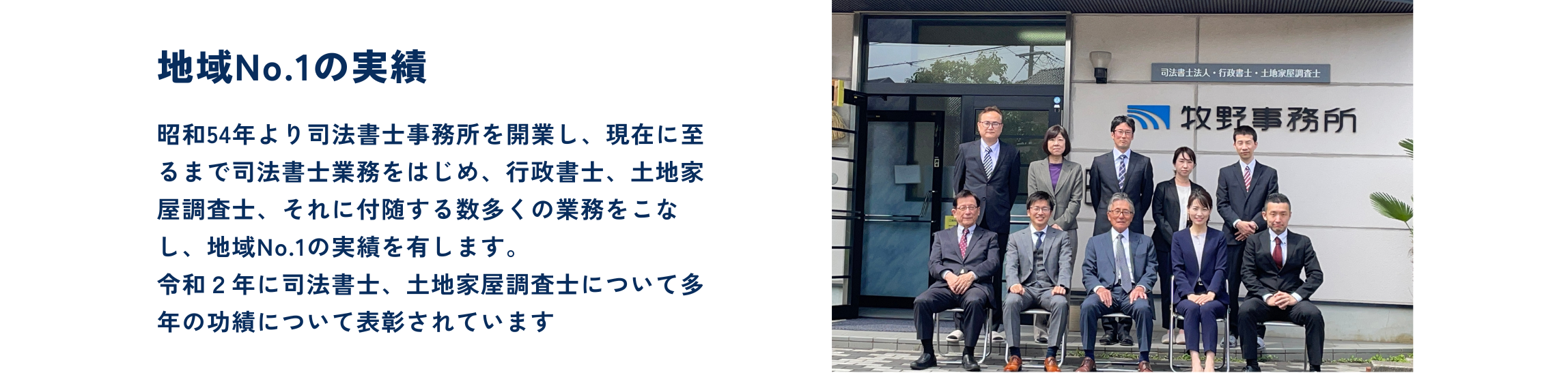 Service取扱い業務 News&TOPICS ワンストップ・サービス 一連の手続きの中で様々な業務を行う必用がある場合でも、司法書士、土地家屋調査士、行政書士といった複数の資格を有しているため当方事務所でスピーディーに解決します!税理士や弁護士等とも連携力にも自信があります! 安心できる環境を創造する 社会情勢による権利義務の変化や、法律の改正によるルールの複雑化が発生しているます。安心できる環境造りを提案しつつ、解決に向けて皆様と歩んでいきます! 地域No.1の実績 昭和54年より司法書士事務所を開業し、現在に至るまで司法書士業務をはじめ、行政書士、土地家屋調査士、それに付随する数多くの業務をこなし、地域No.1の実績を有します。令和2年に司法書士、土地家屋調査士について多年の功績について表彰されています。 ACCESS MAP